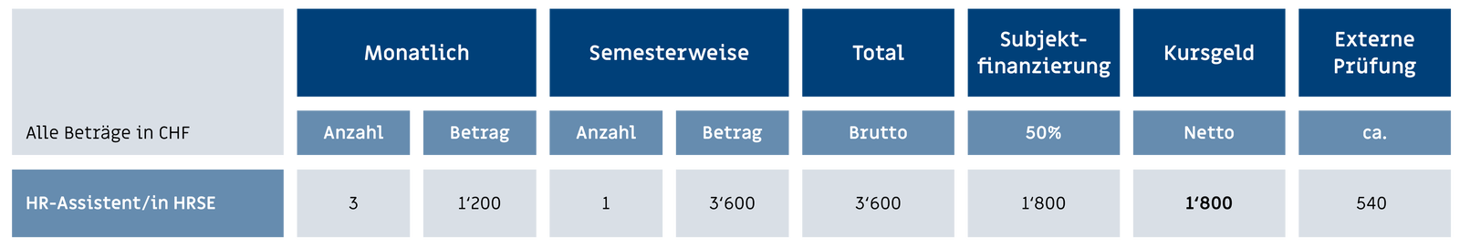 Der Bund unterstützt Studierende bei ihrer Vorbereitung auf eidgenössische Berufsprüfungen (eidg. Fachausweis) und höhere Fachprüfungen (eidg. Diplom) mit finanziellen Beiträgen im Rahmen der Subjektfinanzierung mit 50% der Unterrichtskosten, Lehrmittel und Materialien. Diese Subvention wird nach Absolvierung der eidgenössischen Prüfung, unabhängig vom Prüfungsresultat, auf Antrag des Studierenden vom Bund ausgerichtet. Falls Sie die eidgenössische Berufsprüfung «HR-Fachleute» nachfolgend absolvieren, erhalten Sie auch einen Bundesbeitrag von 50% auf den Preis des Bildungsgangs HR-Assistent:in HRSE.