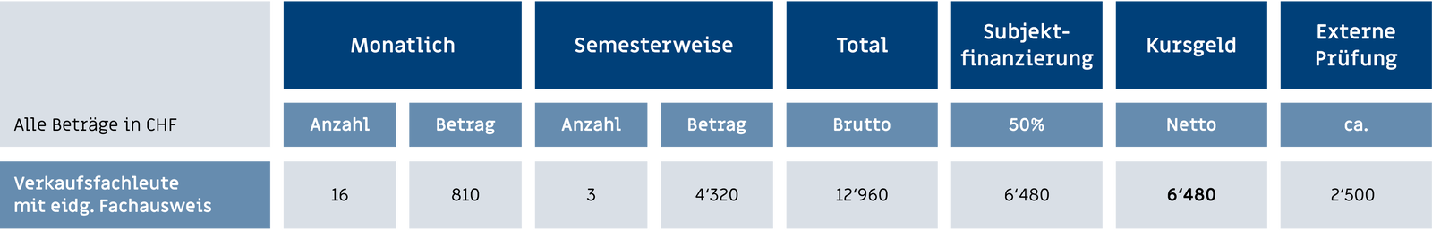 Im Kursgeld sind Unterricht, Lehrmittel, Lernplattform, Fallstudienkorrekturen und Simulationsprüfungen schriftlich und mündlich enthalten. Nicht enthalten sind persönliche Auslagen bei allfälligen Workshops und Seminaren für Verpflegung. Externe Prüfungsgebühren werden direkt an die Prüfungskommission bezahlt. Die Prüfungsgebühren können von Jahr zu Jahr ändern (Stand: 01.05.2020). Preisänderungen bleiben vorbehalten.
